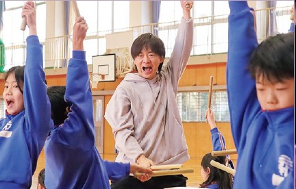 三和小学校みつわ太鼓の皆さんに指導する山田さん。体育館に和太鼓の振動と子どもたちの笑顔が広がる。