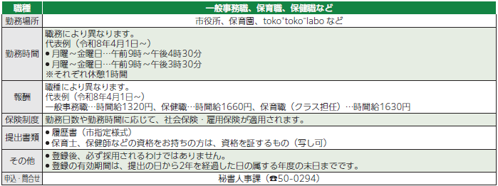 しごと 会計年度任用職員(パート職員)の登録を随時受け付けています 5/31 前の記事 次の記事 発行日 : 2026年01月01日 自治体名 : 愛知県江南市 広報紙名 : 広報こうなん 令和8年1月号 採用が必要な業務が発生したときに、登録者へ連絡します。 ■申込 ウェブ申込または履歴書(秘書人事課、市ホームページに用意)を秘書人事課(保育職はこども未来課) Tweet シェアする 会計年度任用職員(パート職員)を募集します(2) 確定申告、市民税・県民税の市内申告会場と事前予約のご案内