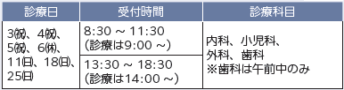 ※天候による休診は、受付時間内に電話でお問い合わせを、診療日の医師・歯科医師は、市ホームページをご覧ください。