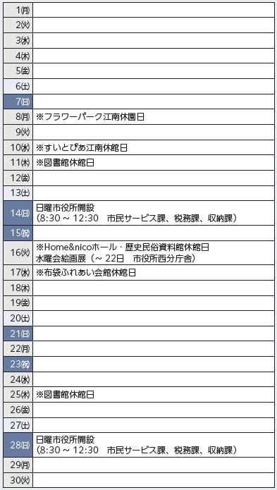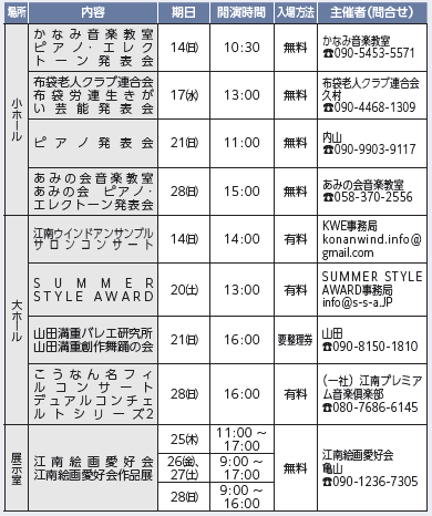 イベント 9月の催し物 29/31 前の記事 次の記事 発行日 : 2025年09月01日 自治体名 : 愛知県江南市 広報紙名 : 広報こうなん 令和7年9月号 ■市民カレンダー ■Home and nicoホール(午前9時~午後9時30分【電話】55-2321) 詳しくは主催者へお問い合わせください。 ■江南市役所西分庁舎 (月曜~金曜日…午前8時30分~午後5時15分 催し物期間中の土曜・日曜日、祝休日…午前9時~午後5時【電話】内線225) 内容:水曜会絵画展 期間:16(火)~22(月) Tweet シェアする 9月の生活情報 人口、事故件数など