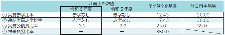江南市は全ての指標が早期(経営)健全化基準値内であり、健全性が保たれています。