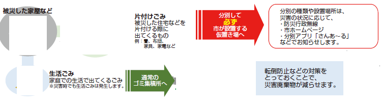 ■災害廃棄物の処理災害廃棄物は市が設置する「仮置き場」に分別して持ち込みます。適正な分別をすることで処理期間が短くなり、悪臭の発生や害虫被害の抑制、ガスボンベなどによる火災の発生防止につながります。事前に分別をしてから持ち込むようにしてください。