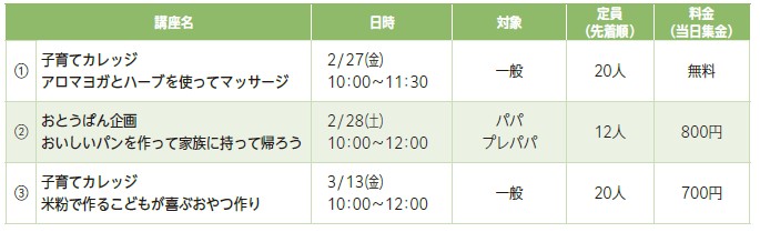 ※(1)(3)は託児(1歳~就園前児・1人500円・先着5人)あり。希望者は2/2(月)から申込先窓口へ。