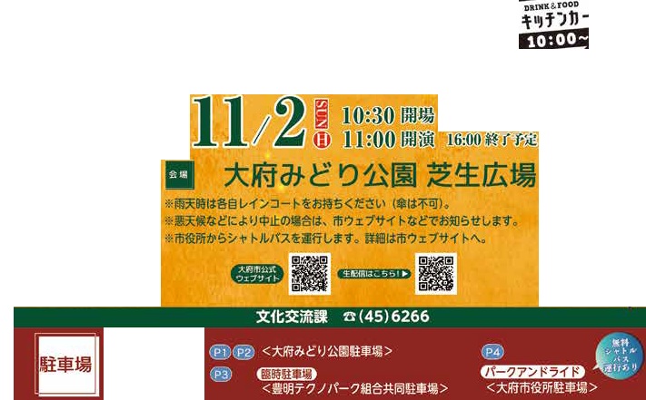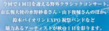イベント おおぶ野外クラシックコンサート2025【入場無料】 16/64 前の記事 次の記事 発行日 : 2025年10月01日 自治体名 : 愛知県大府市 広報紙名 : 広報おおぶ 2025年10月1日号 雨天決行 ※詳しくは本紙をご覧ください。 Tweet シェアする 第9回 大府東浦花火大会 OBU-1 グランプリ 2025 with メディアス