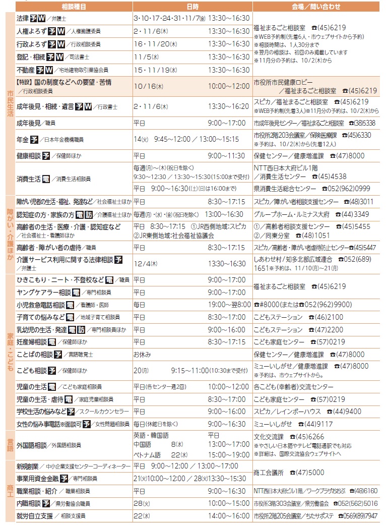くらし 10月の相談 53/64 前の記事 次の記事 発行日 : 2025年10月01日 自治体名 : 愛知県大府市 広報紙名 : 広報おおぶ 2025年10月1日号 各種相談とも無料で相談でき、秘密厳守です。 相談には、参考となる書類などをお持ちください。 予…予約制 W…WEB予約 電…電話相談可 訪…訪問相談可 Tweet シェアする 番組放送のお知らせ 子育て情報