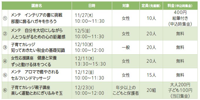 ※(3)は託児(1歳~就園前児・1人500円・先着5人)あり。希望者は、11/4(火)から申込先窓口へ。