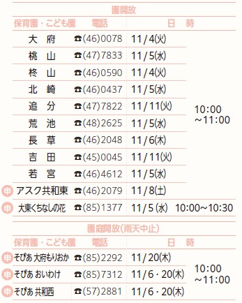 問合せ:各保育園(平日9:00~16:00)