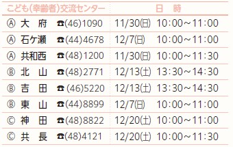 申込:(A)11/2(日)(B)11/4(火)(C)11/19(水)9:00から電話または各こども(幸齢者)交流センター窓口へ。