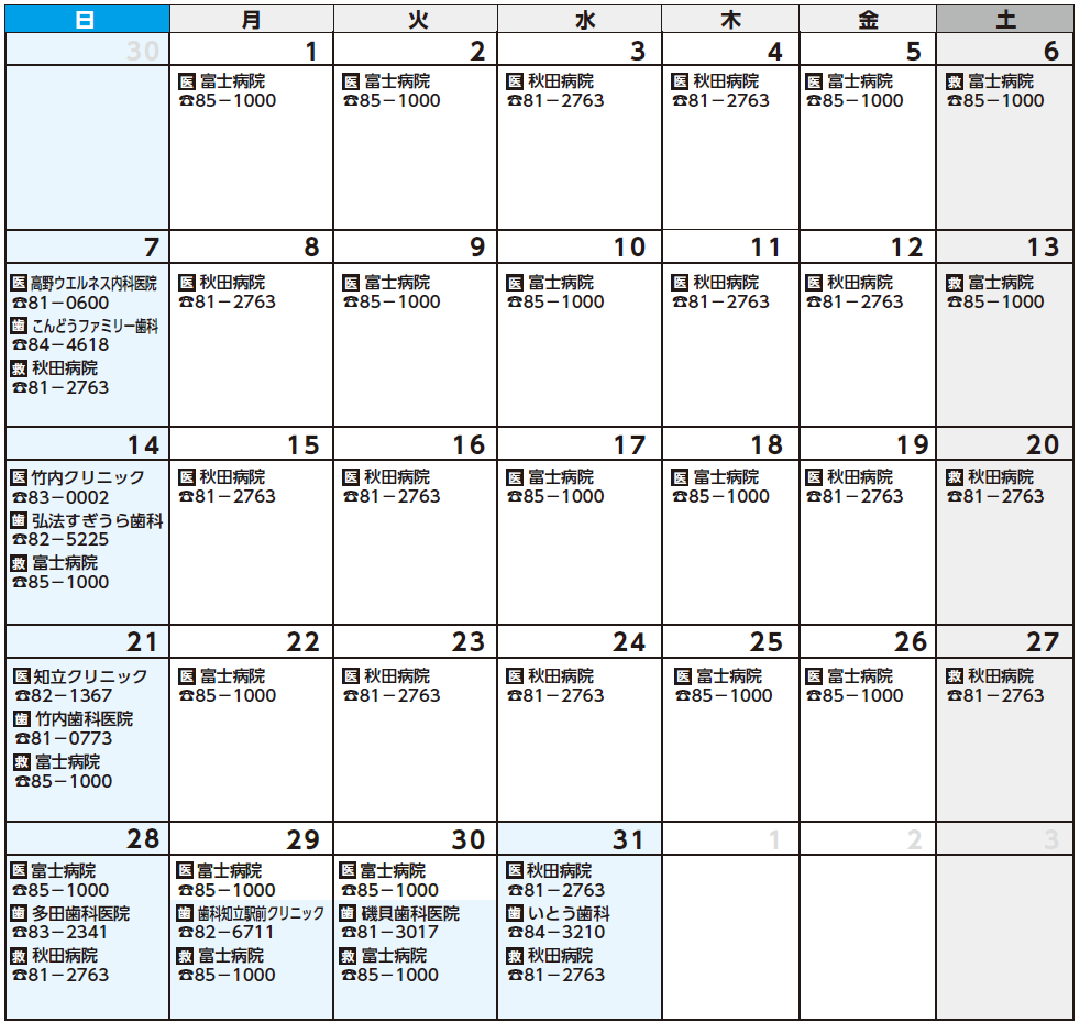 (!)当直医は都合により変更することがありますので、電話で確認のうえ受診してください。