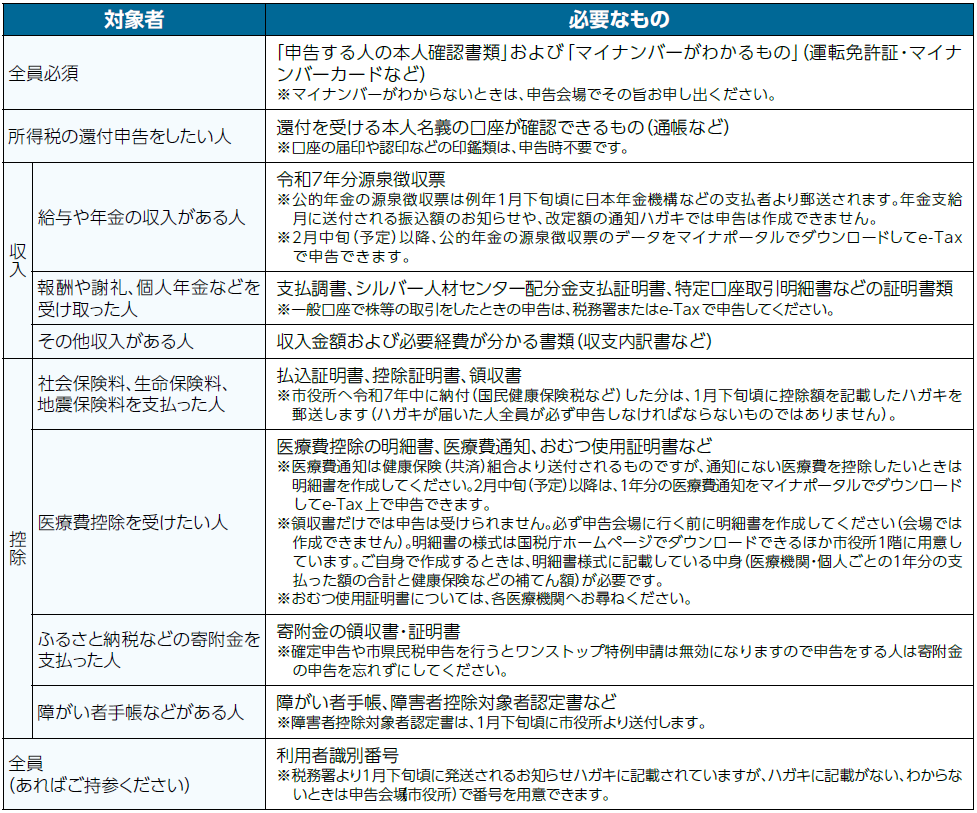 〇市役所会場や出張申告会場で申告を受ける人は申告書を会場で用意しますので事前に準備する必要はございません。ただし、申告時に医療費控除の明細書が必要な人は事前に作成してください。