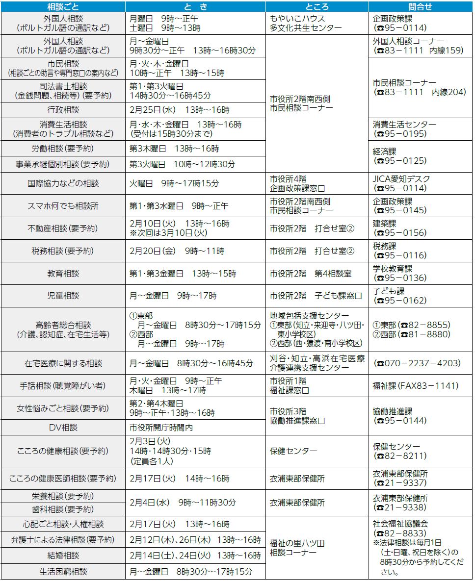 くらし 2月の無料相談 27/44 前の記事 次の記事 発行日 : 2026年02月01日 自治体名 : 愛知県知立市 広報紙名 : 広報ちりゅう 令和8年2月号 ※相談日が祝日にあたる場合はお休みになります。 Tweet シェアする 2月し尿収集予定表 今月の納税等