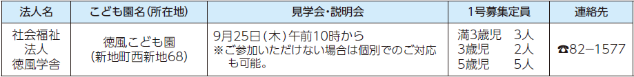 ※徳風こども園(2号・3号)の入園説明会(保育所等紹介)は10月15日(水)午前10時からです。