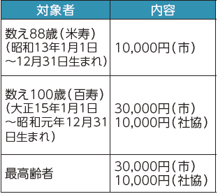敬老の日は、長年社会に貢献してこられた高齢者に感謝し、長寿を祝う日です。長寿のお祝いとして次の対象者には、市および社会福祉協議会から敬老金を9月に贈呈する予定です。