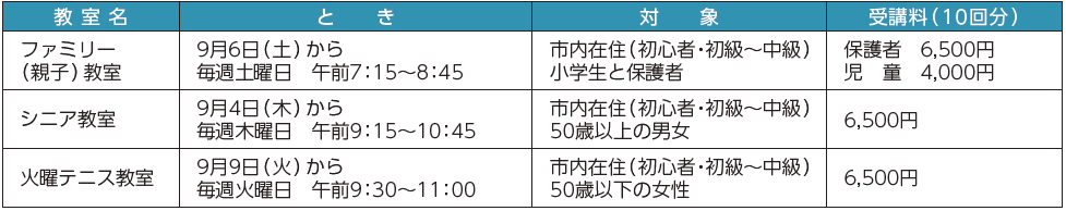 申込み・問合せ:各教室の開催初日1週間前までに住所・氏名・年齢・連絡先を電話またはファックスで知立市テニス協会 加藤(【電話・FAX】81-3299 携帯【電話】090-3386-2525)へご連絡のうえ、お申込みください。