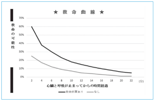 脳は、心臓が停止すると約15秒以内に意識がなくなります。その後、約4分以上そのままの状態が続くと回復することが困難となります。心臓の動きが停止している間、心肺蘇生によって脳や心臓に血液を送り続けることがAEDの効果を高めるとともに、心臓の動きが戻った後に後遺症を残さないためにも重要です。命が助かる可能性は時間とともに減少しますが、その場に居合わせた人が心肺蘇生を行った場合、助かる可能性が高くなります。救える命を助けるために!!