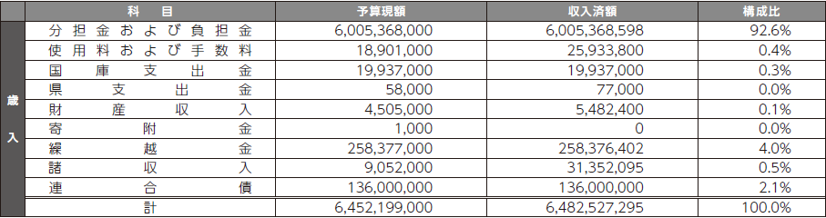 歳入では、関係市の分担金が60億536万8,598円で全体の92.6%を占めています。