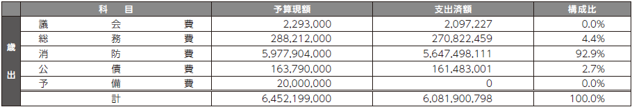 歳出では、消防費が56億4,749万8,111円で全体の92.9%を占めています。
