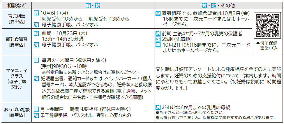 子育て 子育て・健康10月(1) 38/45 前の記事 次の記事 発行日 : 2025年10月01日 自治体名 : 愛知県知立市 広報紙名 : 広報ちりゅう 令和7年10月号 ■子育て掲示板 ◇児童センター 18歳未満の子どもは誰でも遊ぶことができます ◇子育て支援センター いろいろな育児講座を実施しています ■乳幼児健診 場所・問合せ:保健センター 【電話】82-8211 ■母子相談など ※電話相談は随時受け付けています。 場所・問合せ・申込み:保健センター 【電話】82-8211 Tweet シェアする マイナンバーカード休日窓口 子育て・健康10月(2)
