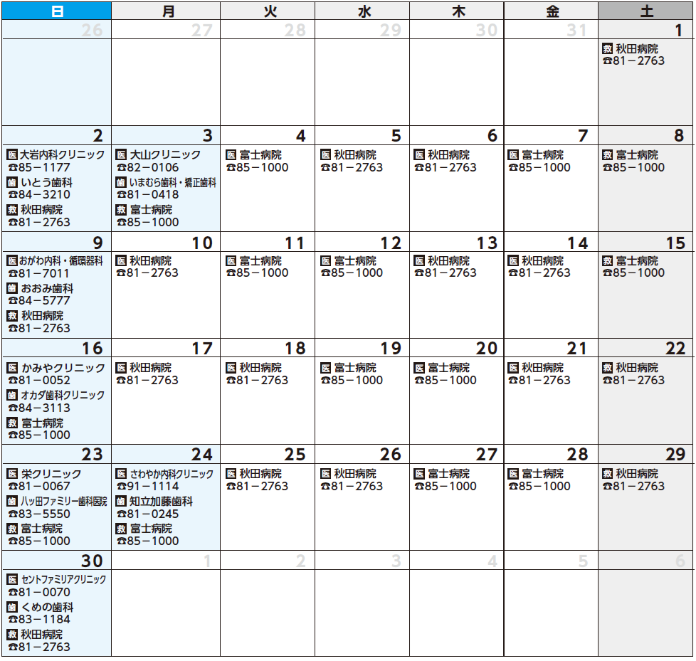 (!)当直医は都合により変更することがありますので、電話で確認のうえ受診してください。