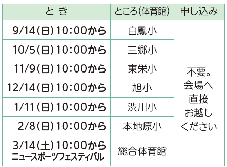 地域の団体(子ども会など)から「ニュースポーツ」や「レクリエーションスポーツ」の行事を開催したいとの要望があれば、用具持参で委員を派遣します(1団体につき各年度1回まで)。