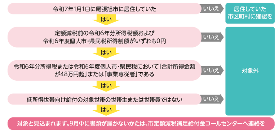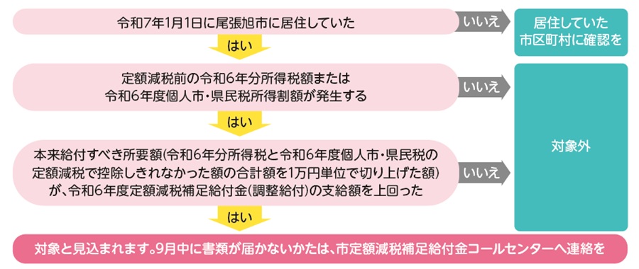 令和6年度に実施した定額減税補足給付金(調整給付)において、支給額に不足が生じたかたなどに、給付金を支給します。フローチャートで対象かどうか確認してください。市で把握できる対象者には、9月中旬に確認書を発送します。事業専従者の一部のかたは確認書を発送できないことがあります。また令和6年中に本市に転入したかたには原則確認書を発送しません。支給対象となるかたで9月中に書類が届かないかたは、市定額減税補足給付金コールセンター(【電話】0570-085-888、9/1(月)開設(土日祝を除く8:30~17:15))へ連絡を