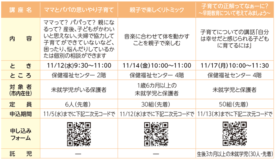 託児:生後6カ月以上の子(6カ月未満の子は同室受講)
