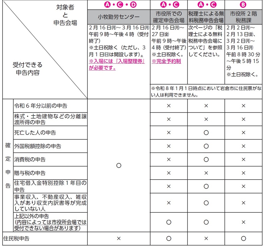 申告会場によって受付できる内容が異なりますので、注意してください。