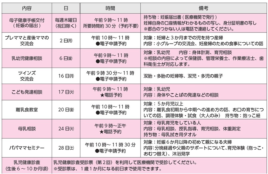 4か月児健康診査(令和7年10月生)、1歳おめでとう教室(令和7年2月生)、1歳6か月児健康診査(令和6年7月生)、2歳3か月児歯科健康診査(令和5年11月生)、3歳児健康診査(令和5年2月生)の対象者には個別通知をしています。
