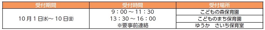 第1希望がこどもの森保育園・こどものまち保育園・ゆうか さいち保育室の場合は下記受付期間に申込書を提出してください。