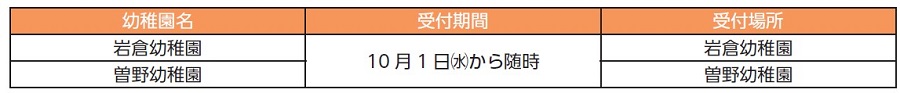 入園申込書を9月1日(月)から30日(火)まで(土日祝を除く)各認定こども園で配布します。認定こども園へ入園を希望する場合は、直接各園へ問い合わせください。曽野第二幼稚園子どもの庭保育園に申込書を取りに行く場合は、事前に園に連絡してください。