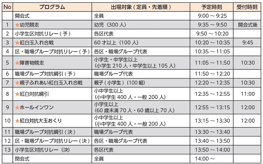 ★マークの競技は当日受付。受付時間に入場門までチケットを受け取りにきてください。
