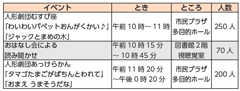 ※時間は状況により前後します。また、おはなし会による読み聞かせは先着順です。