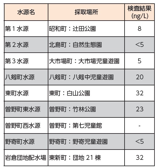 検査を実施したすべての給水栓で暫定目標値(50ng/L※)を下回りました。なお、岩倉団地水源では、県水と自己水を7対3の割合で供給しています。今後は、3カ月に1度の頻度で検査を実施し、水質監視の強化を図ります。