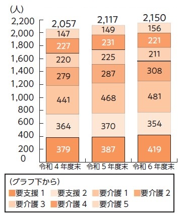 要介護(要支援)認定者数は2,150人で、令和5年度末から33人増加しました。