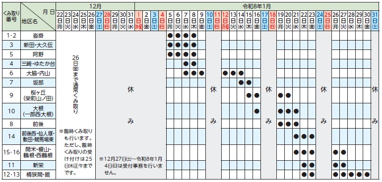 ○年末年始はごみの量が多いため、通常とは収集時間が大幅に変わる場合があります。