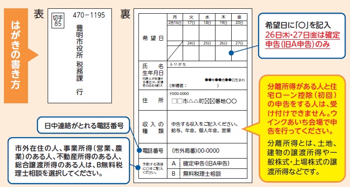 申込み:はがきまたは豊明市あいち電子申請・届出システムによる完全事前予約制(窓口・電話での受付不可)