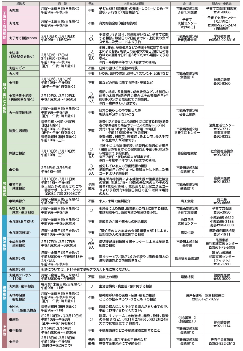 くらし 2月・3月 相談窓口 31/34 前の記事 次の記事 発行日 : 2026年02月01日 自治体名 : 愛知県豊明市 広報紙名 : 広報とよあけ 令和8年2月1日号 相談無料。秘密厳守。お気軽にご相談ください。 《対象》★は市内在住、●はどなたでも Tweet シェアする とよあけ花マルシェコラム 公民館まつり