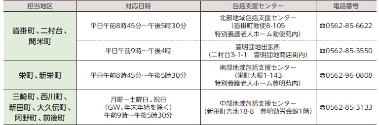 ※土曜日、祝日(GW、年末年始を除く)午前9時~午後5時30分は、中部地域包括支援センター(【電話】0562-85-3133)にて全地区の相談を受け付けます。