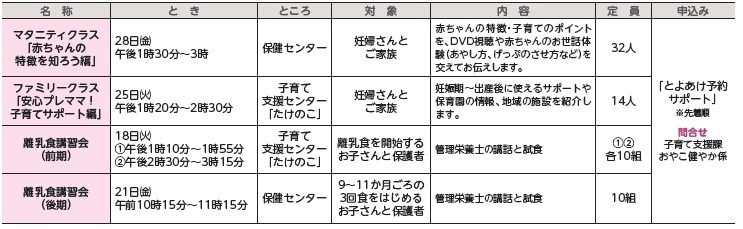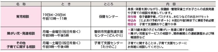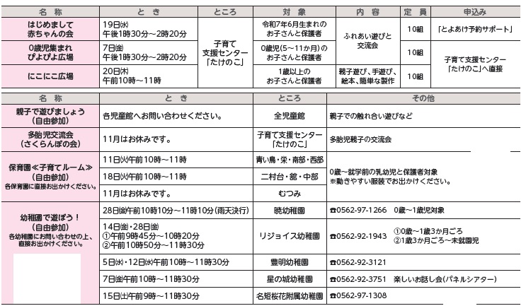 各施設は、上記以外の行事や相談も行っていますので、お気軽にお問い合わせください。