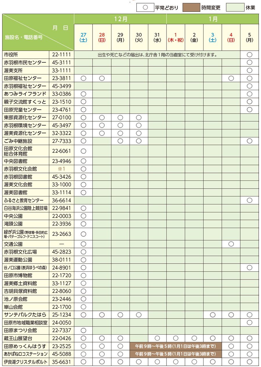 くらし 〔ここ見て!たはら〕年末・年始の業務について 8/47 前の記事 次の記事 発行日 : 2025年12月01日 自治体名 : 愛知県田原市 広報紙名 : 広報たはら 令和7年12月号 ※1 赤羽根文化会館への問い合わせは赤羽根文化広場(【電話】45-2823)をご利用ください。 ・サンテパルクたはらは1月7日(水)に臨時休園します。 Tweet シェアする 〔ここ見て!たはら〕令和7年度上半期の「市の家計簿」を公表します たはらスナップ