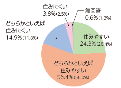 80.7%の方が、「住みやすい」または「どちらかといえば住みやすい」と評価しており、前回の調査と比べて、3.7ポイント減少しています。