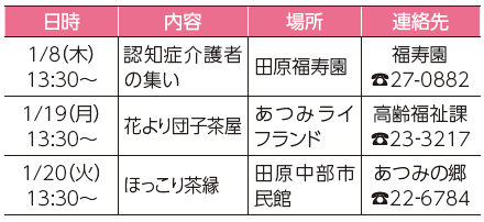 1月の開催予定です。認知症に関することなどご相談ください。相談日に都合の悪い方は、高齢福祉課までお問い合わせください。