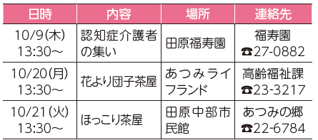 10月の開催予定です。認知症に関することなどご相談ください。相談日に都合の悪い方は、高齢福祉課までお問い合わせください。