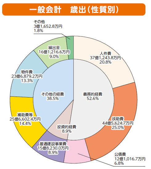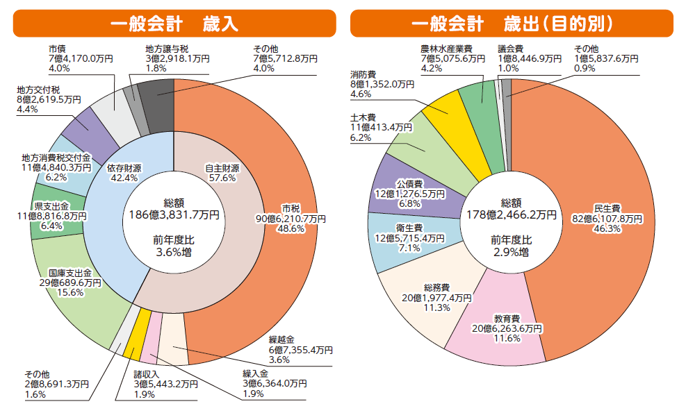 令和6年度歳入歳出決算の状況について、市民・事業所の皆さんから納めていただいた税金などが、どのように使われたのかをお知らせします。一般会計では歳入決算額186億3,831.7万円(前年度比3.6%増)に対し、歳出決算額178億2,466.2万円(前年度比2.9%増)となり、令和7年度へ繰り越した事業に充てるための財源2,349.1万円を除いた実質収支が7億9,016.4万円の黒字になりました。