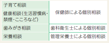 妊娠・出産・子育て期の切れ目ない支援に向けたサービスの説明とお話を伺うため、1時間程度保健師と面談をします。「妊婦のための支援給付」の手続も行います。ご予約の上、保健センターへお越しください。