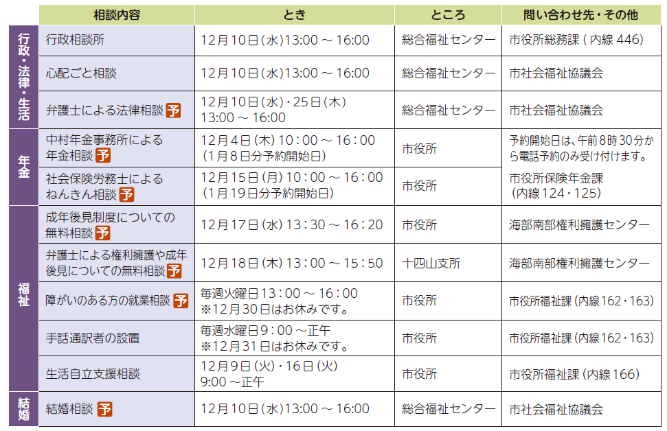 くらし 各種相談 26/28 前の記事 次の記事 発行日 : 2025年12月01日 自治体名 : 愛知県弥富市 広報紙名 : 広報やとみ 令和7年12月号 問合せ: ・市社会福祉協議会 【電話】65-8105 ・海部南部権利擁護センター 【電話】69-8181 Tweet シェアする 【12月】保健センターだより(2) 平日夜間・休日診療