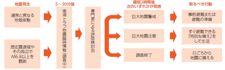 南海トラフ地震の想定震源域内で、通常とは異なる地殻変動またはマグニチュード(M)6.8以上の地震が観測されると、気象庁が「南海トラフ地震臨時情報(調査中)」を発表します。直後に専門家らによる評価検討会の結果を受けて、危険度が高い順に「巨大地震警戒」「巨大地震注意」「調査終了」のいずれかの情報を発表します。危険度によって、取るべき行動が変わりますが、慌てることなく日ごろから家族構成に応じた備蓄品などを用意するとともに、ガラスの飛散防止対策、家族で安否確認方法の話し合い、避難所や避難経路の確保などの対策を行いましょう。