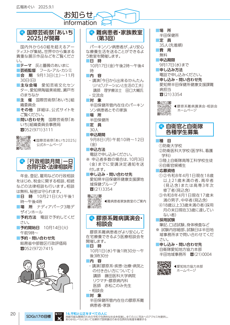 くらし 広報あぐい 2025年9月1日号 P.20 20/22 前の記事 次の記事 発行日 : 2025年09月01日 自治体名 : 愛知県阿久比町 広報紙名 : 広報あぐい 2025年9月1日号 Tweet シェアする 広報あぐい 2025年9月1日号 P.19 広報あぐい 2025年9月1日号 P.21