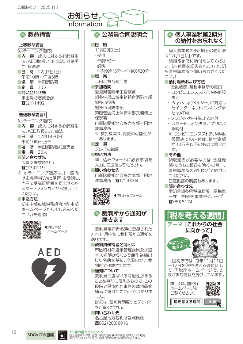 くらし 広報あぐい 2025年11月1日号 P.12 12/14 前の記事 次の記事 発行日 : 2025年11月01日 自治体名 : 愛知県阿久比町 広報紙名 : 広報あぐい 2025年11月1日号 Tweet シェアする 広報あぐい 2025年11月1日号 P.11 広報あぐい 2025年11月1日号 P.13