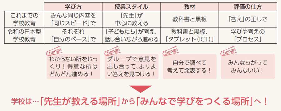 これまでは、先生が主体となって教壇の前に立ち、子どもたち全員に一斉に教える形でした。令和の日本型学校教育では、子どもたちの多様性を重視し、一人ひとりのスピード、理解度、やりたいことに合わせて学習を進めます。また、先生たちで内容や進め方を決めるのではなく、児童・生徒で意見を出し合い、話し合って物事に取り組みます。